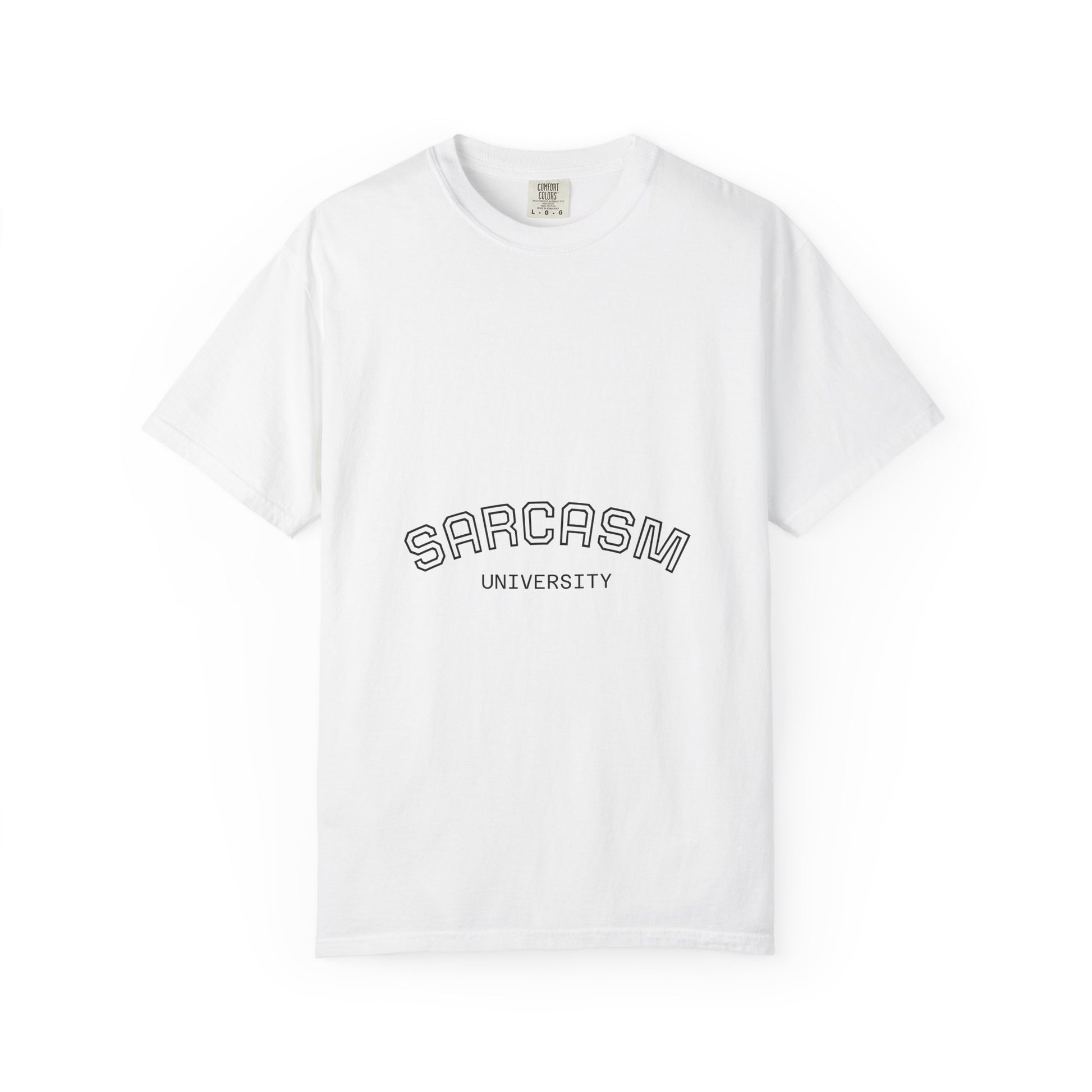 A laid-back, garment-dyed tee that speaks fluent dry humor. The soft, medium-weight cotton drapes easily across the shoulders and carries a subtle embossed-style “SARCASM UNIVERSITY” arc on the chest — the kind of quiet, witty statement that starts conversations without shouting. It’s knit tubular for a clean, seam-free silhouette and garment-dyed after construction for a lived-in color and supple hand. Wear it to coffee runs, late lectures, or nights out when you want to look effortless and a little clever.